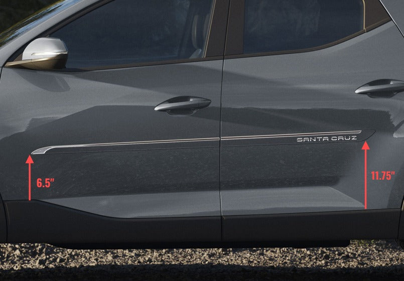 The VIPER is among our best sellers! Its style offers a bold look, combining paint-match color trims, chrome cut-out logo, stylish chrome insert with an embedded side reflector. Yes, you can have it all ! This molding will protect your doors from bumps and scratches for years to come without losing its sleek finish. Ride in style with Designer Trim's VIPER specially made for your Hyundai Santa Cruz (Pickup)